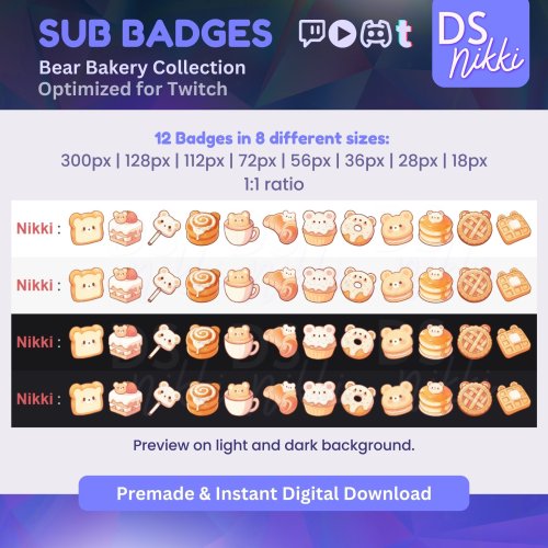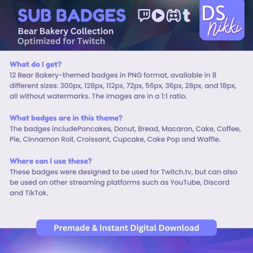 These badges were designed to be used for Twitch.tv, but can also be used on other streaming platforms such as YouTube, Discord and TikTok.