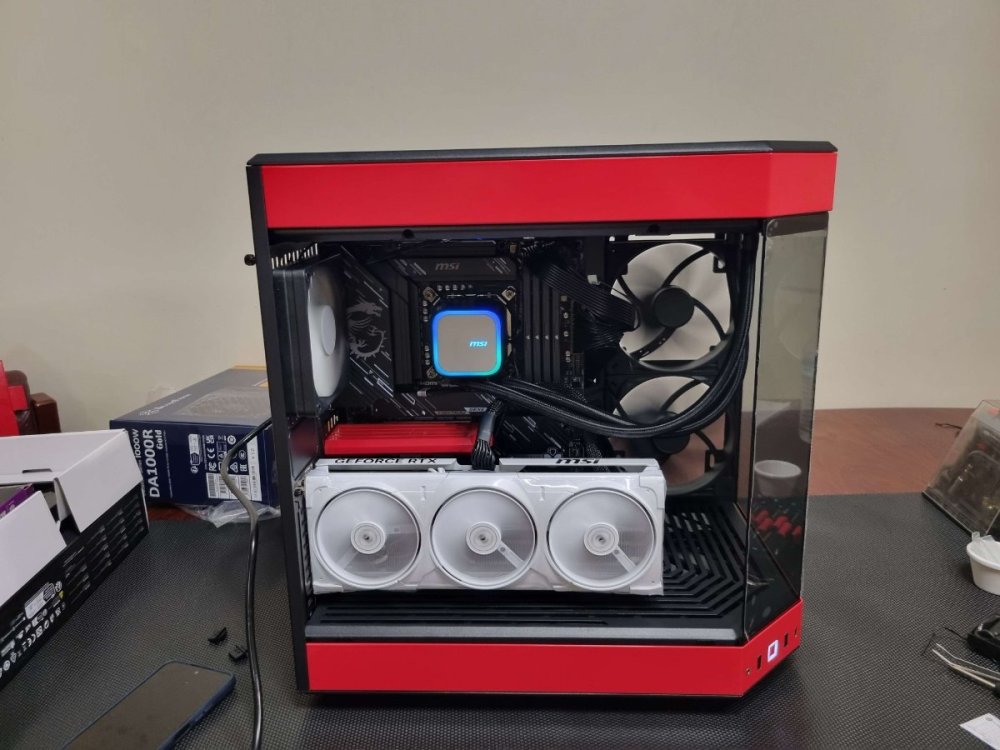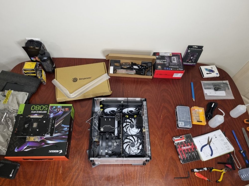 Kintsugi Build Log Step 1: Alright so I started by grabbing the motherboard out and placing it on it's box Step 2: I then opened the CPU socket on the motherboard and whilst making sure the arrows in the corner lined up, installed the CPU into it's socket. Then I closed the socket with the lever, popping off the cover in the process Step 3: Next step I did was grab my CPU water block mounts and installed them into the motherboard, after that I then applied the thermal paste to the CPU and screwed on the water block. Step 4: I grabbed my 4 sticks of ram and installed them in the ram slots. Step 5: Then I grabbed out my case, laid it down and removed the side panel. (The next step was done out of instinct as it's the way I have usually build PC's, however I would 100% recommend you do this step after you have installed the Power Supply into the included Powerboard and then into the case) Step 6: I then installed the motherboard into the case, using the cases included mounting screws. Step 7: I then had to install the Powerboard onto the Power Supply, however this was easier said than done, let me explain. The sheer amount of force that it took to install was unbelievable. I had to use all my might to make sure every connector was 100 percent inserted. I thought it was quick and easy to install, but after close examination I found that the connectors werent going in without me forcing them. Step 8: Once I had it completely inserted I had to get the Power Supply and Powerboard installed into the case. On the backside of the case there was a small hook shaped bracket that needed to be removed as well as a Power Supply cover bracket. Got both of them out, and now had to get the Power Supply in. At this moment I realized this case actually had another bracket on the bottom of the inside of the case, this bracket was to be preinstalled onto the Power Supply prior to its installation in the case. I unscrewed the 2 screws holding this bracket into the case and installed the bracket onto the Power Supply. Step 9: Now that I have rectified the bracket issue, I can finally install the Power Supply into the case, and this is where my issue I mentioned earlier arose. Installing the Power Supply with the Motherboard already installed was almost impossible, I had to kind of angle it into place, where the Powerboard would slot into the mentioned hook shaped bracket. Once I had that lined up, I was able to screw the bracket I had previously installed onto the Power Supply to the bottom of the case. Step 10: At this point I was ready to start working on the Radiators, both of which were 240mm and required 2 fans installed onto each prior to their installation into the case, so that's what I did, I then went to install the radiators into the case and quickly found out that the screws that came with the radiator (which are long enough to go through a standard metal frame case which is usually only about 2 or 3mms thick) were not long enough to go through the thicker acrylic on this case. So I had to go and get some M4x10mm bolts (12 of them). Once I had the necessary bolts, I then installed the radiators to the case. Step 11: Alright so at this point, it was starting to look like a computer but with a very messy birds nest of cables everything, so I took a little bit of time moving the cables around and connecting the 2 fans of each radiator together, daisy chain style and plugged them into the Powerboard. I also grabbed the included 24 pin and 8 pin ribbon cables that came with the case, and got them installed into the Powerboard and Motherboard. Step 12: Now this is where another issue arose for me, I was so quick to get things installed into the case, I forgot that this case comes with a touch screen button and that the cable wasn't installed into the case yet, I so had to grab that cable out of the box, and my long reach tweezers and plug it into the bottom of the Powerboard and into the bottom of the front panel of the case. Step 13: Now it was time to get the Graphics Card installed, so this case specifically came with a riser cable, so I installed it into the Motherboard and then installed the Graphics Card into the vertical mounted riser PCIE slot. Step 14: At this point I was ready to get all my fittings installed onto the Graphics Card, CPU block, both Radiators and the reservoir. Now the Graphics Card came with the plugs on the back and the space for the fittings at the front, so firstly this was where I had to waste some time and get the Graphics Card out of the case again, and move the plugs from the back to the front. Now I was able to install the Graphics Card fittings into the back of the Graphics Card. Step 15: Now I can actually get my fittings in without issue, firstly I installed a 90 degree g1/4 brass fitting into the inlet and outlet of the Graphics Card, with one facing upwards but on a slight angle towards the CPU block and the other going straight towards the bottom of the reservoir panel on the front of the case. Once they were on, I then installed a g1/4 to 14mm OD brass fittings onto both. Step 16: Next step was to add my 2 fittings into the CPU block, now 1 of which, the right side, was a 25mm extension fitting and a 90 degree fitting facing down towards the Graphics Card fitting I had previously fitted, after that I then installed a g1/4 to 14mm OD fitting. The left side of the CPU block though was a straight fitting, ready for a clear tube to install. Now this was a big issue that arose once the building process had already been started. The bend necessary to get from the CPU block to the top Radiator was impossible with brass pipes. Brass pipes can only make a 90 degree bend with enough length as to not crease or crack. Now I'm going to mention now, that I did also have this issue with another part of the water loop. When going from the back Radiator to the top of the Reservoir panel at the front of the case, so I had to install a clear tubing here as well. Step 17: Alright, so